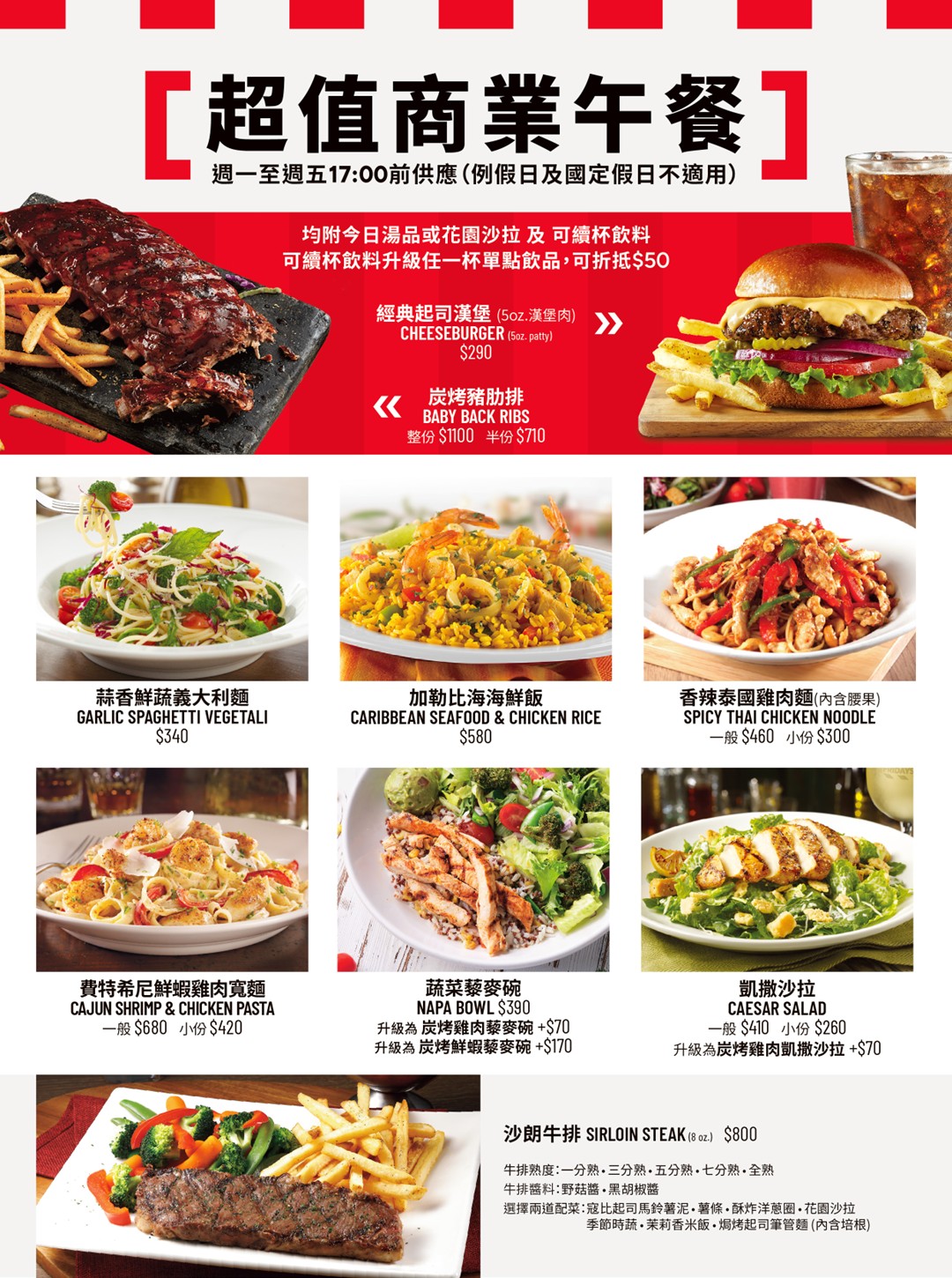 任點商業午餐菜單餐點均附贈一份今日湯品或花園沙拉,及可續杯飲料。